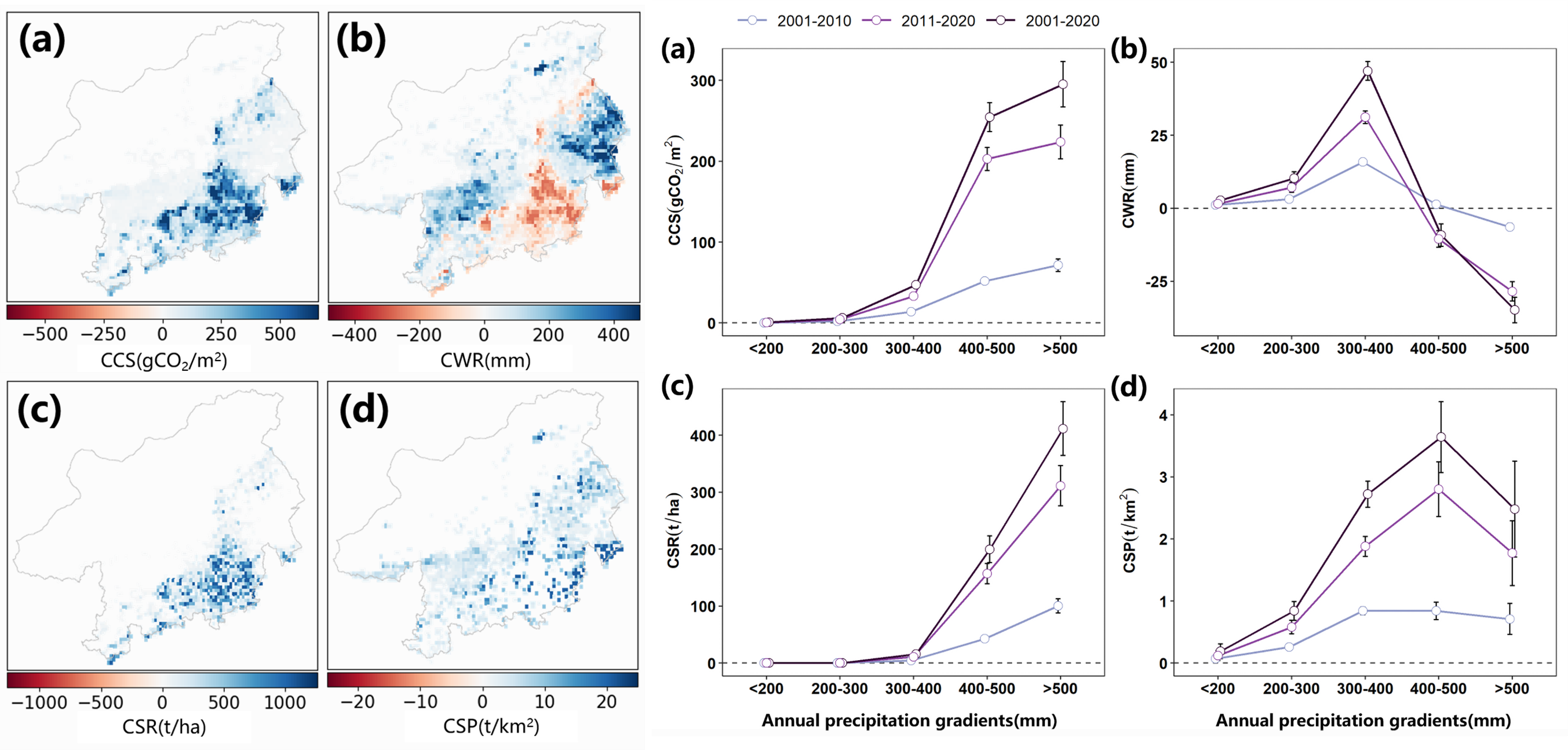 针对上述问题,研究团队以京津风沙源区治理工程区为案例,结合基于遥感的长时间序列土地利用数据集、机器学习模型、生态系统过程模型和生态系统服务评估方法,通过构建多种模拟情景开展分析研究。研究结果显示,生态工程和大气CO2浓度升高是当地碳汇提升的主要原因,并成功抵消气候变化导致碳汇减少的不利影响。生态工程的实施促使固碳、水源涵养、土壤保持和防风固沙服务分别增加22.21%, 2.87%, 2.35%和28.77%。其中植树造林对生态系统服务提升的贡献远高于草地恢复,其中超过91.41%, 98.13%和64.51%新增加的固碳、土壤保持和防风固沙服务由植树造林所贡献。尽管植树造林导致水源涵养服务有所下降,但是这种下降却被草地恢复增加的水源涵养服务所抵消。此外,生态工程对生态系统服务的影响沿着降水梯度也呈现出明显的差异。