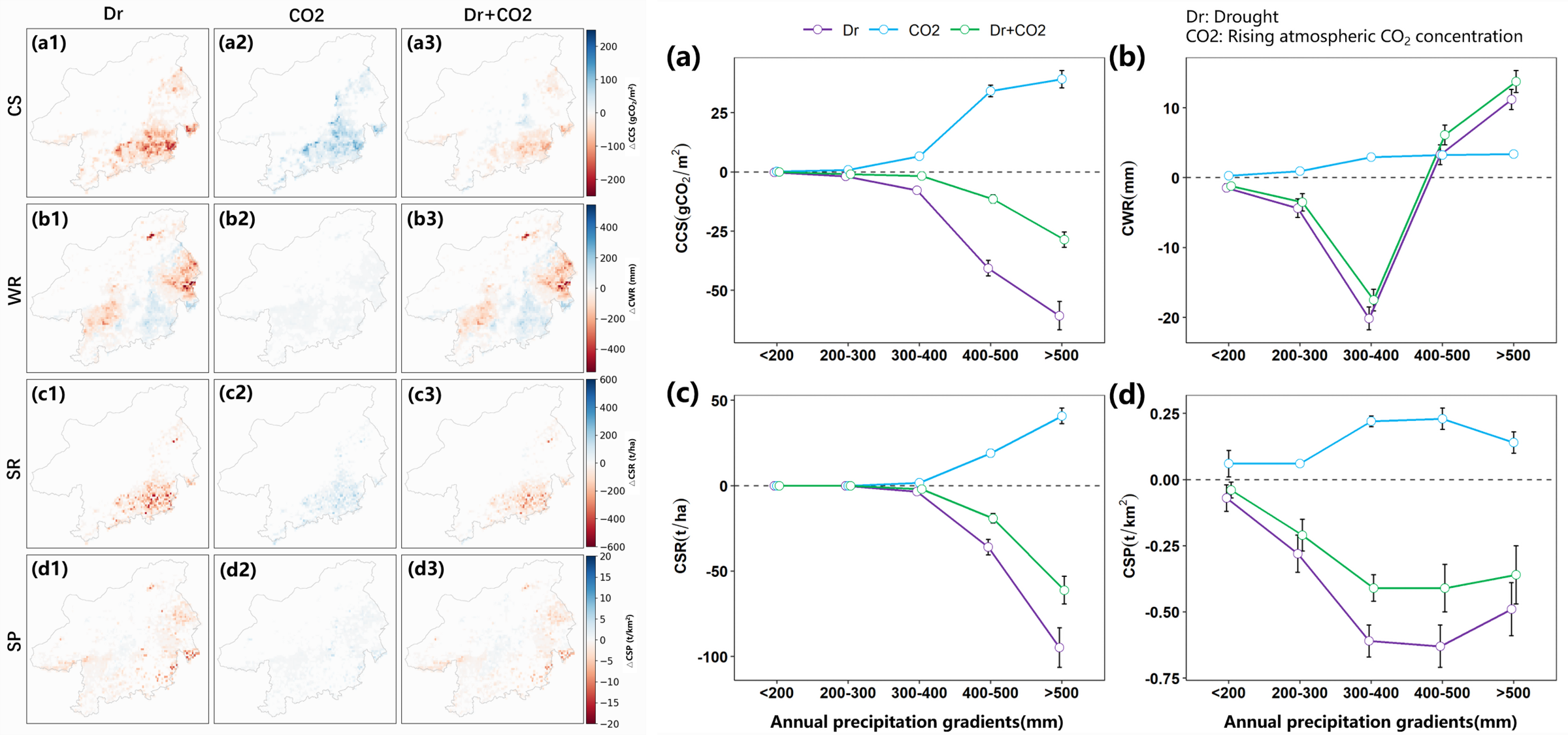 上世纪,由于不适当的人类活动,自然生态系统发生了严重退化。为扭转这一趋势,以联合国REDD+(The United Nations Collaborative Programme on Reducing Emissions from Deforestation and Forest Degradation in Developing Countries plus)计划为代表的旨在恢复退化生态系统的生态恢复项目在世界范围内广泛开展。先前的研究发现,这些生态工程在恢复退化的生态系统和增强生态系统服务供给方面具有显著成效。同时,由于CO2排放持续增加导致的全球气候变暖使得地球的气候系统越来越不稳定。这种变化不仅导致大气CO2浓度不断升高,还导致干旱事件的发生频度、广度和持续时间不断增加。已有研究表明气候变化对生态系统服务的影响不容忽视。然而,目前尚不清楚气候变化如何影响生态工程在增强区域生态系统服务供给方面的作用。