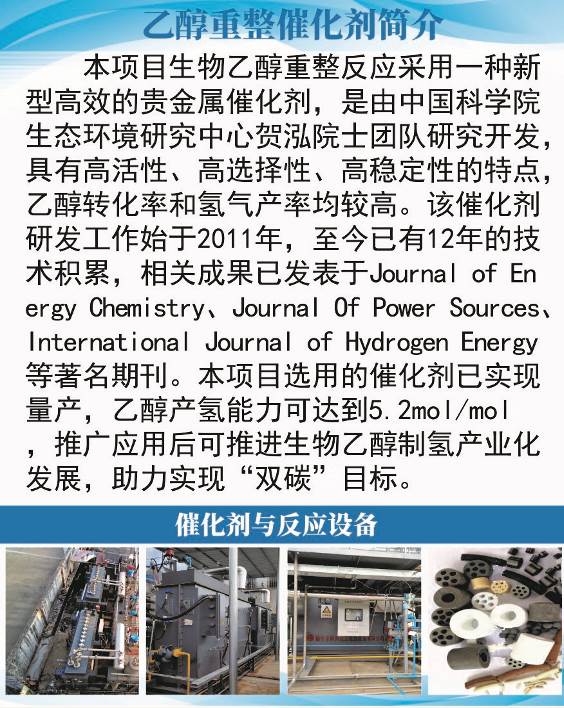 该装置采用了由生态环境中心贺泓院士团队历时十余年研发的高效制氢催化剂,融合了氧化重整制氢工艺和解析气催化氧化技术,能够在较高的能量效率下稳定运行。本首台生物乙醇重整制氢装置的成功投运,能有利促进集装箱式撬装设备的开发,加快实现氢能绿色供应,助力双碳目标的实现。