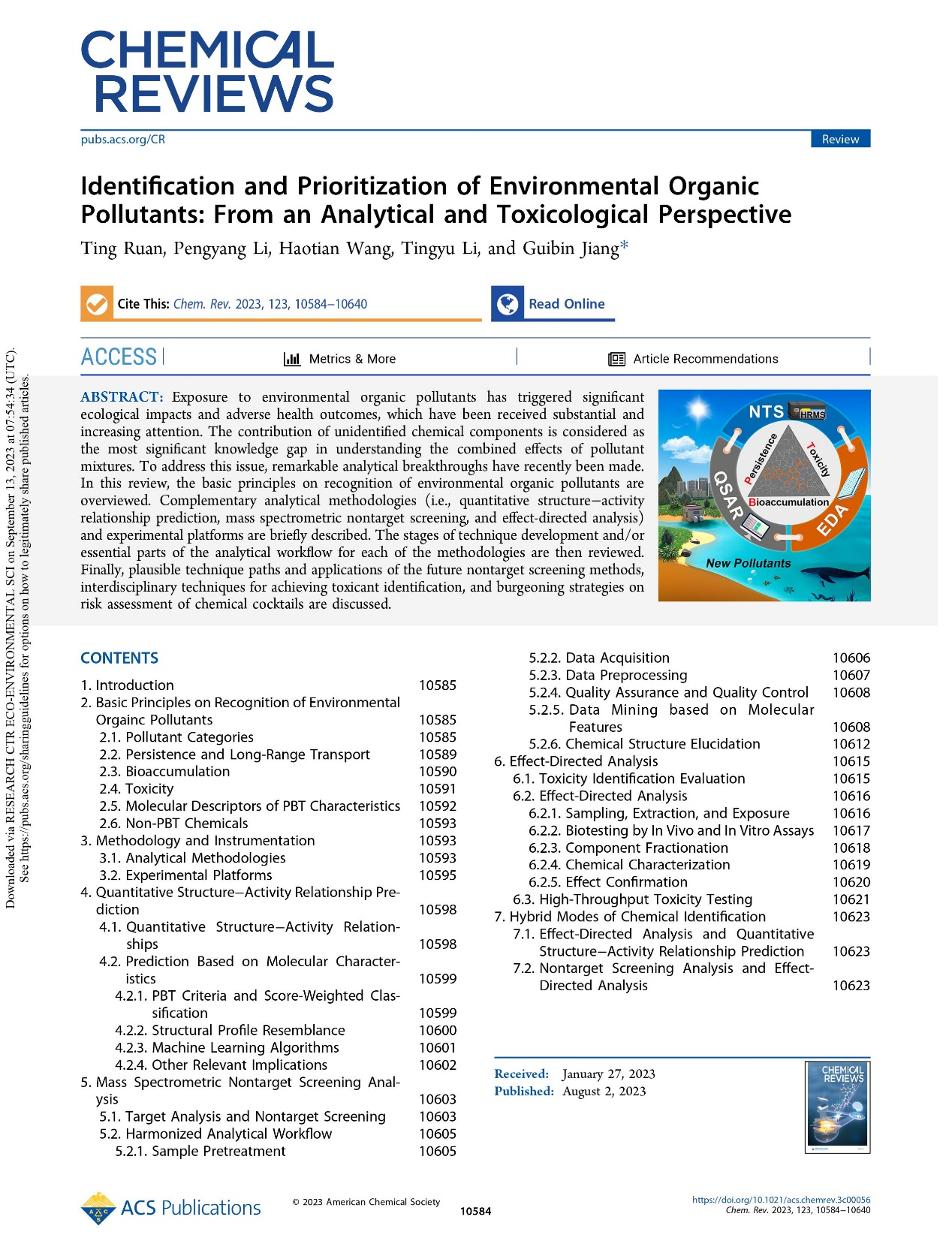 9月13日,由阮挺研究员等撰写的综述论文“Identification and Prioritization of Environmental Organic Pollutants: From an Analytical and Toxicological Perspective”在化学领域权威期刊Chemical Reviews正式发表。