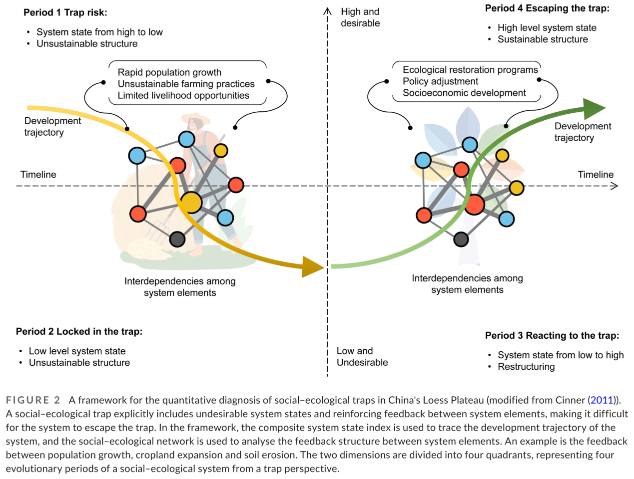 生态系统退化和贫困是威胁人类可持续发展的重大挑战,以我国典型生态脆弱区——黄土高原为例,该区长期以来面临着植被稀疏、土壤侵蚀严重、土地生产力低,人口压力大,生计贫困等突出问题,形成了越垦越穷、越穷越垦的局面,影响该区可持续发展。作为可持续性科学中广泛关注的新兴概念,社会-生态陷阱就是指自我强化的社会和生态反馈维持或推动社会-生态系统朝着不理想的状态发展,可用于解释生态系统退化和根深蒂固的贫困。然而,社会-生态陷阱研究仍然缺乏定量的分析方法,制约区域可持续发展状态的科学研判和调控。
