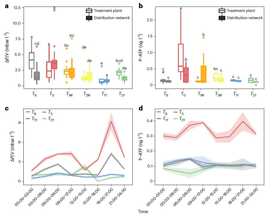 图1水厂和管网内颗粒负荷(?P/V)以及颗粒物附着ATP(P-ATP)的长期(a, b)和日变化(c, d)趋势。图中:TB – 启动RO工艺前;T0 – 启动RO工艺;T1M – 启动RO工艺1个月;T2M – 启动RO工艺2个月;T1Y – 启动RO工艺1年; T2Y – 启动RO工艺2年。