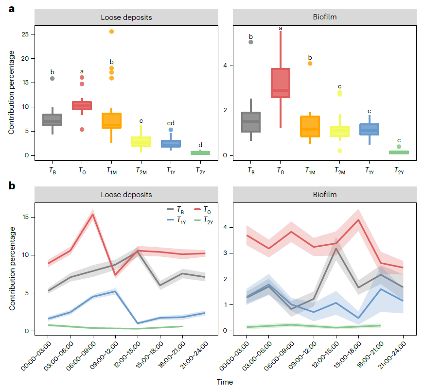 通过SourceTracker2和NCM两种方法,研究发现工艺切换初期管网沉积物与生物膜中微生物均有显著释放(图2),T0与T1M期间成倍增长的释放量与颗粒负荷的增长相呼应,并且伴随着释放微生物物种的显著增加。截至工艺升级2年时,沉积物与生物膜中微生物的释放量急剧降低,因此团队提出通过进水厂工艺升级,可有效调控管网与饮用水之间的微生物交互。SourceTracker2的分析结果显示,在整个两年研究周期中,沉积物中微生物释放的贡献量均高于生物膜,而NCM结果显示沉积物释放的微生物物种数也显著高于生物膜。这一发现有别于管网水质问题源于生物膜的传统观点,但符合团队前期关于沉积物是导致水质恶化热区的发现。此外,研究观察到沉积物与生物膜贡献量差异最大的时间点是T0与T1M,意味着沉积物比生物膜对水质变化更敏感,因此在应对过渡效应时应格外重视来自管网沉积物的贡献与风险。
