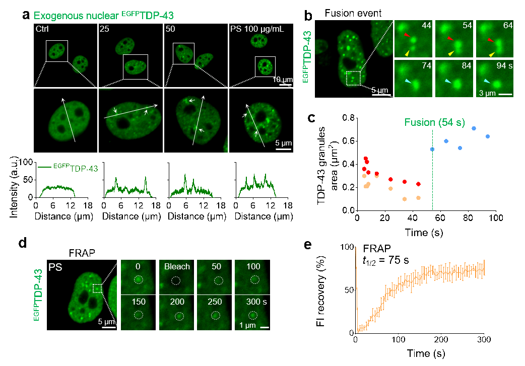 液-液相分离(Liquid-liquid phase separation, LLPS)是介导生物大分子在细胞中时空调控的重要机制,参与多种重要生物功能调控。然而,异常相分离与神经退行性疾病密切相关, LLPS的异常相变被认为是导致胞浆形成TDP-43(TAR DNA binding protein-43, TAR DNA结合蛋白43)蛋白聚集并引发ALS的关键致病机制之一。需要特别指出的是,我们的疾病模型并不是渐冻症,不能由此推断这种纳米颗粒与渐冻症的关联。