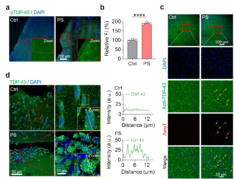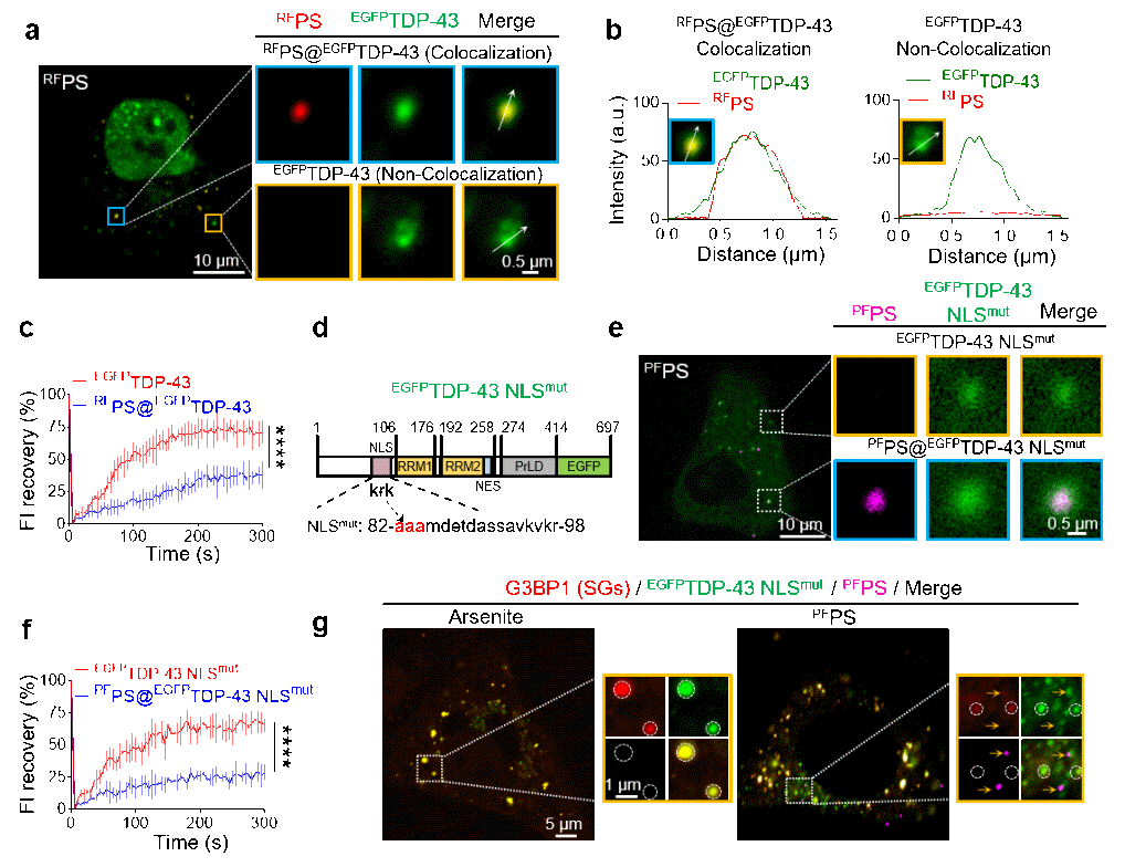 受损的Hsp70无法护送TDP-43回到细胞核以及有效的蛋白质量控制,导致TDP-43在细胞质中积聚并促进了PS和TDP-43之间形成“PS@TDP-43 complexes”,加剧细胞质TDP-43的凝结和固化。应激颗粒(Stress granules, SGs),一种多成分组装的无膜细胞器,被认为是异常定位的TDP-43的短暂“庇护所”,内部的RNA或DNA可延缓TDP-43病理化。然而,由于PS@TDP-43 complexes之间的相互作用限制了细胞质TDP-43募集至SGs,进一步促进细胞质TDP-43病理化结构形成。