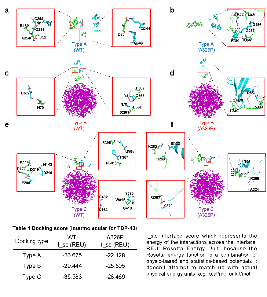 纳米颗粒吸附蛋白质通常会改变其结构特征,主要是因为纳米颗粒表面具有独特的化学和物理性质,与蛋白质之间的相互作用可能会促进蛋白质的纤维化速率。通过计算机分子对接模拟了TDP-43在PS表面的分子间相互作用,结果表明PS的存在改变了TDP-43分子间的相互作用,主要体现为TDP-43分子间亲和力提高和分子间相互作用位点增多。两分子TDP-43同时对接PS时,TDP-43分子间的相互作用更强,这可能归因于PS的对接或接触导致TDP-43在界面作用力下使结构域内的残基重新排列或暴露,从而加强分子间相互作用。