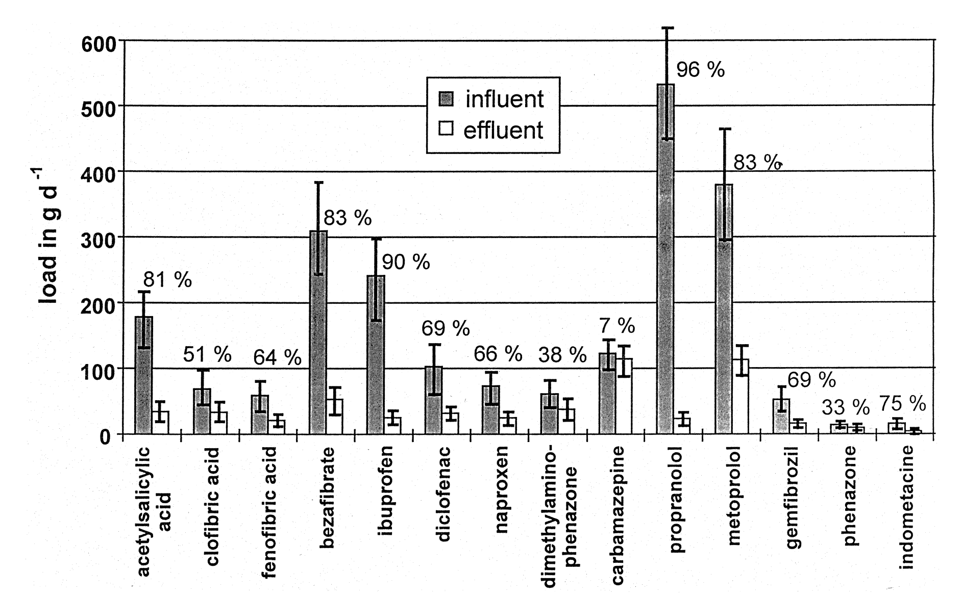 图1.市政污水处理厂药物进出水负荷及去除率