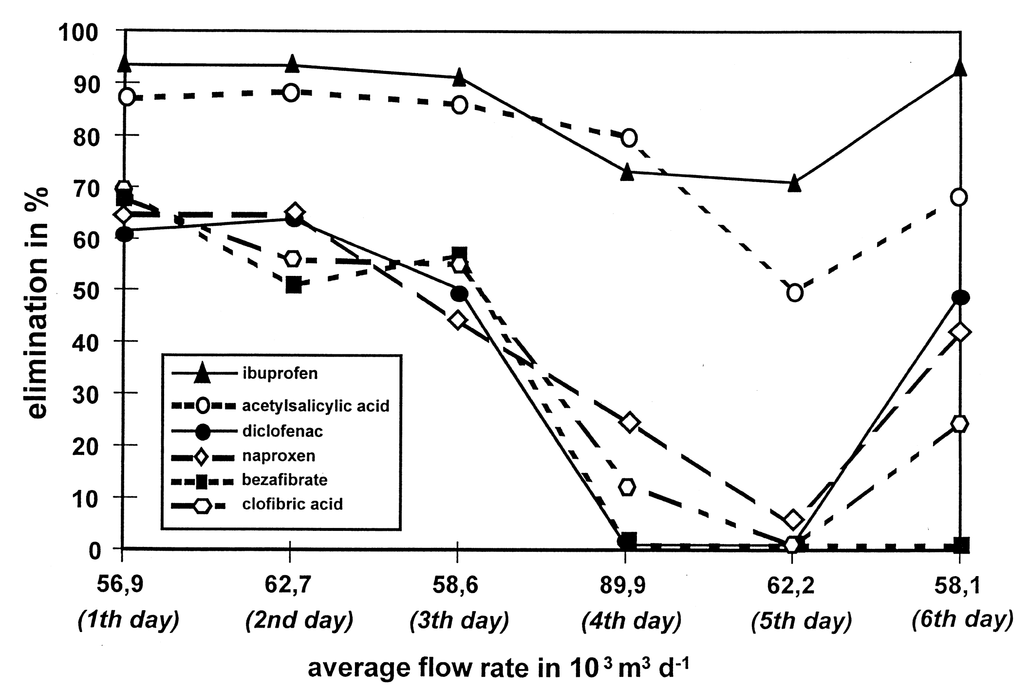 图2.市政污水处理厂中药物去除率随时间及水量变化情况(第4天出现降雨,流量显著增加)
