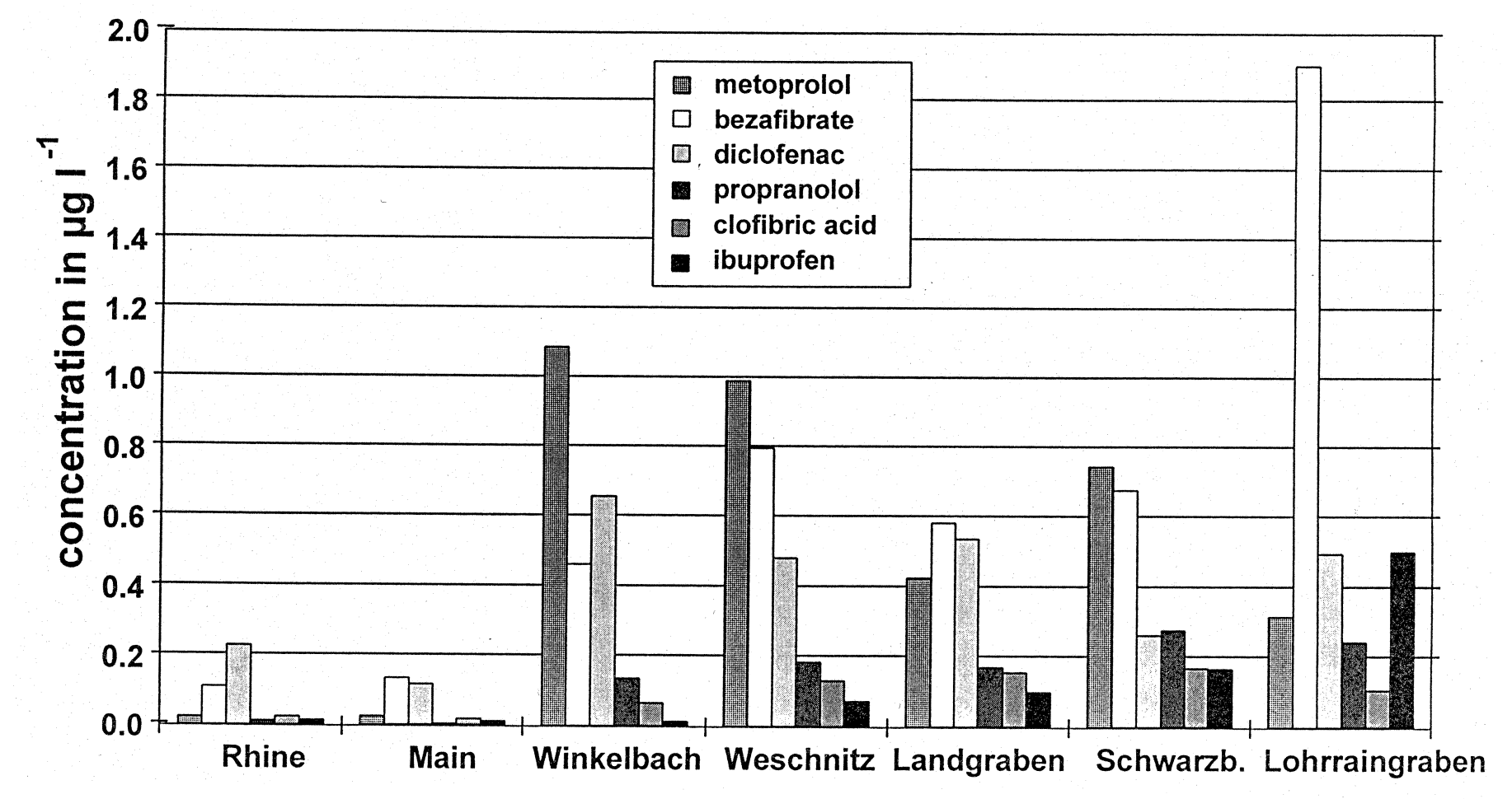 图3.不同河流中污染物浓度分布情况(其中Rhine和Main为大型河流,其余为小型河流)