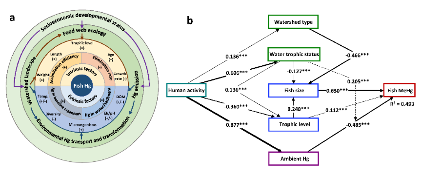 甲基汞是毒性最强的汞化合物之一,可沿食物链富集累积,鱼类消费是人类汞暴露的主要途径之一。鱼类汞含量与环境汞浓度、鱼类特征及食物网结构密切相关(图1a)。这些因素又受控于人为活动,但尚不清楚各因素对鱼汞累积的具体贡献。目前对人为活动如何驱动鱼类汞含量的地理差异认识有限,阻碍了汞污染的有效管理。