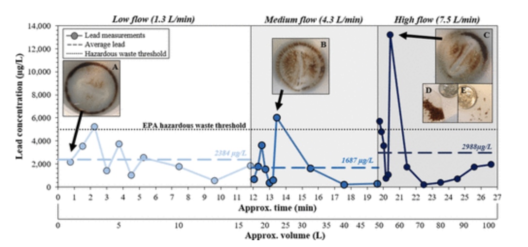 2015 年 4 月 28 日,在一户已知存在水含铅问题的家庭中,根据时间和流速,从厨房冷水龙头采集了 32 个水样。所有 32 个样品的铅含量均高于 EPA 行动水平 15 μg/L,最低浓度为 217 μg/L。冲洗超过 20 分钟后,收集的样品(>50 L)含有 13200 μg/L 铅,几乎是美国环保署危险废物标准的三倍。因此,即使按照当地建议的在用水前冲洗管道 25 分钟,也无法保护居住者免受水中过量铅的影响。