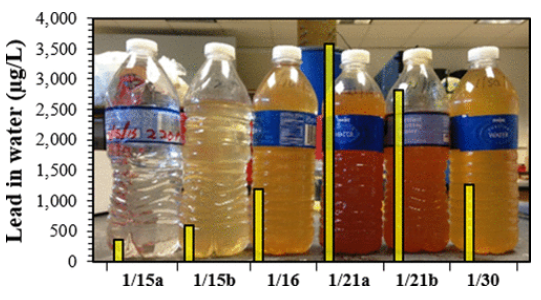 图4 2015 年 1 月收集的水样水变色与铅浓度之间的关联。原始样品瓶的照片上覆盖着水中铅浓度的条形图。