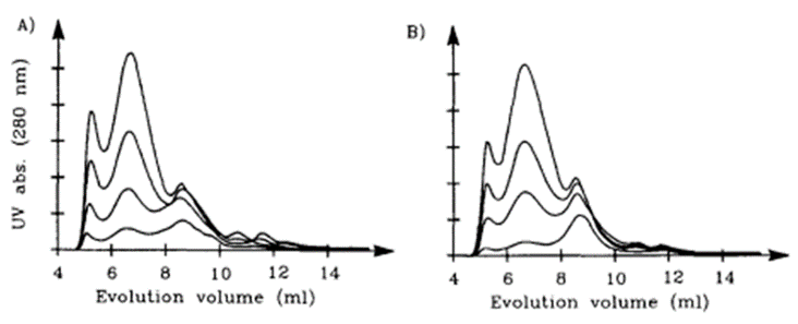 图2. 两种污泥不同提取时间的HPLC-SEC分析结果,提取时间分别为0.5、4、8和17 h,(A)和(B)分别为两种不同来源污泥,随着提取时间延长,紫外响应信号增强,EPS结构无明显变化