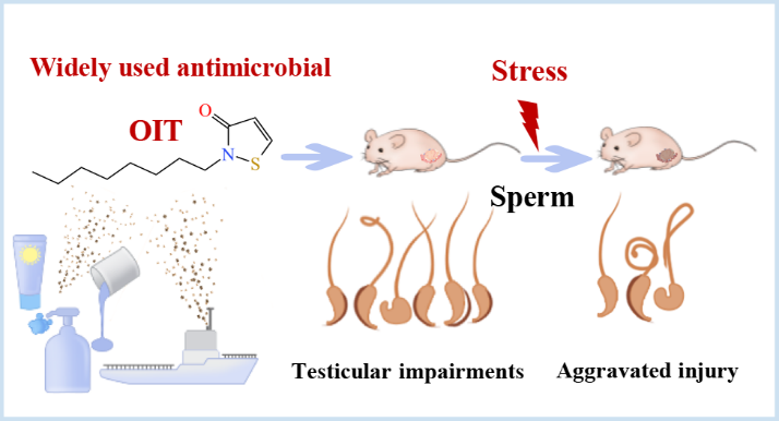 研究团队首先利用体外培养的睾丸支持细胞TM4和生殖细胞GC1筛查了7种典型ITs的细胞毒性,发现几乎所有测试物都有明显的细胞毒性,其中辛基异噻唑啉酮(OIT)的毒性最强;结合体外培养的精子暴露实验,证实DNA和含巯基的谷胱甘肽是OIT的分子靶点,氧化损伤是低剂量OIT毒性的机制之一。进一步动物研究发现,小鼠在孕10.5天(GD 10.5)至出生后10天(PND 10)这一关键发育期的OIT暴露,明显延迟睾丸发育;暴露延长至性成熟PND 56,导致雄鼠精子缺陷,伴随着睾丸组织学结构的异常。以上不良效应即便在人体相关剂量50 μg/kg/d暴露下也显著发生。在此基础上,该研究利用之前建立的白消安诱导生精压力模型,揭示了在生精压力下OIT暴露可增加睾丸对生精压力的易感性,表现出睾丸萎缩严重、精子畸性增加等更严重的雄性生殖损伤。综上研究结果,该研究首次揭示了人体相关剂量下杀菌剂OIT的雄性生殖毒性,提示该污染物尤其在某些污染物复合作用下的雄性生殖风险需要关注。