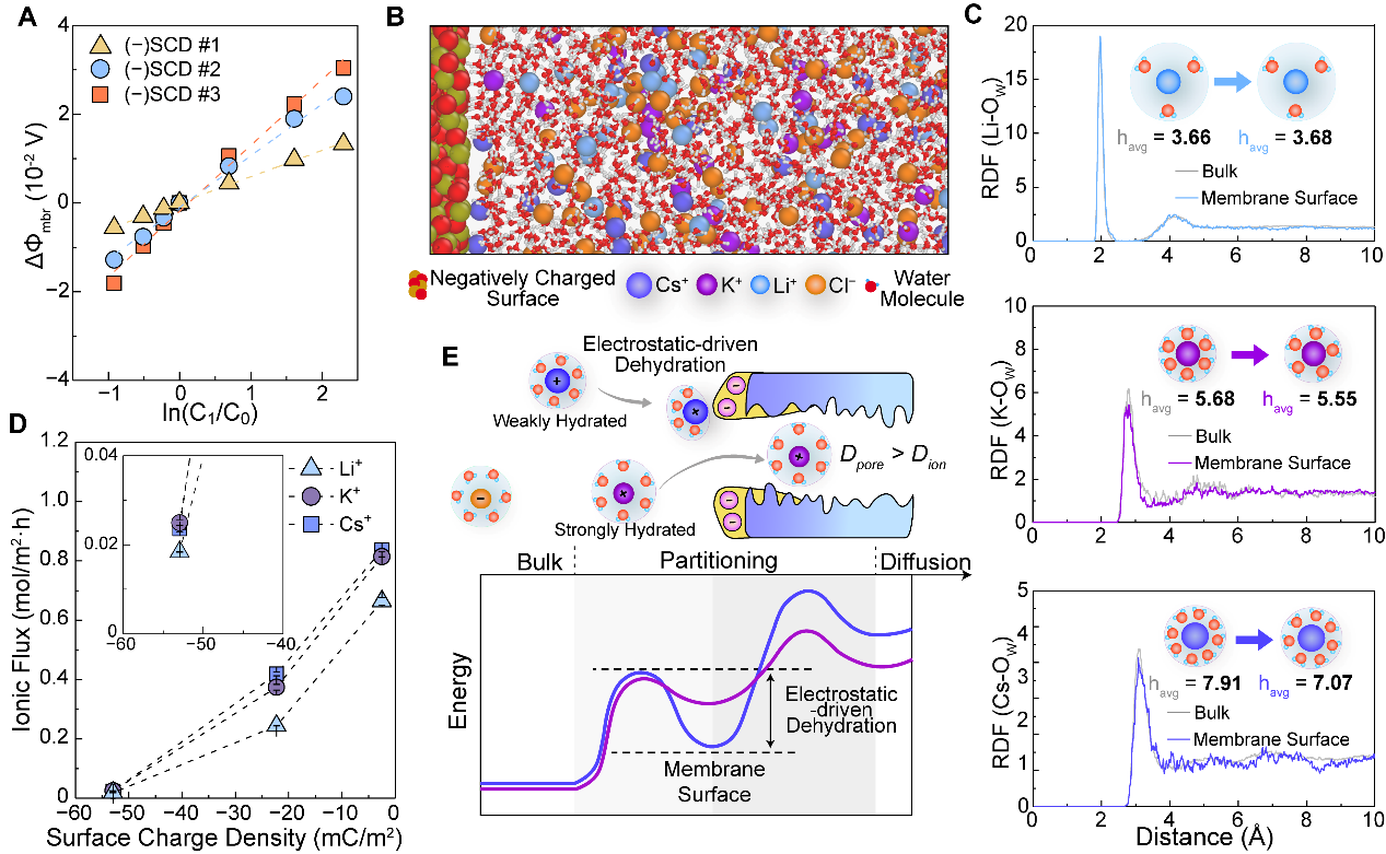 围绕亚纳米孔膜结构和电荷对一价离子选择性跨膜传输微观影响机制不明这一难题,课题组与以色列理工学院Razi Epsztein教授及美国范德堡大学林士弘教授合作,通过对膜表面电荷密度的精准调控,深入解析纳米多孔膜中多种一价金属阳离子跨膜迁移行为,首次定量揭示了膜表面静电效应对迁移反离子(阴离子)脱水吸附的促进作用,从而通过阻碍其分配而影响盐的整体跨膜传输;研究还证实低水合能离子更倾向于在高表面电荷影响下脱水,并显著影响其选择性过孔迁移。相关研究成果以“Electrostatic-driven dehydration of ions in nanoporous membranes”为题于近日发表于Science Advances(DOI: 10.1126/sciadv.adv0174)。