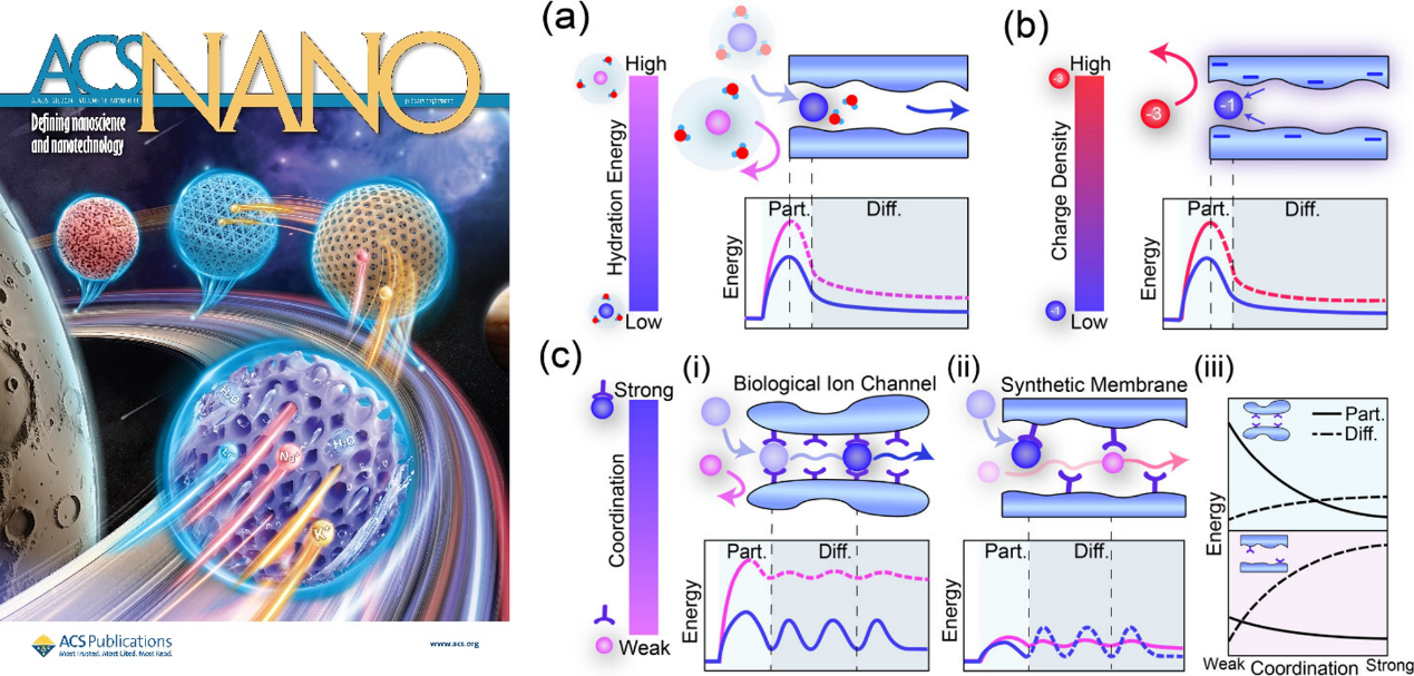 针对纳米限域结构影响膜离子选择性的机制不清的问题,课题组围绕离子选择性膜分离相关研究,系统归纳了亚纳米孔膜材料中纳米限域结构特征及其离子特异性跨膜传输过程,阐明了限域孔道结构对不同离子的选择性跨膜传输机制,展望了离子选择性分离膜领域未来所面临的研究挑战与发展方向。相关研究成果以封面论文发表于ACS Nano(Ion–Ion Selectivity of Synthetic Membranes with Confined Nanostructures, DOI: 10.1021/acsnano.4c00540)。