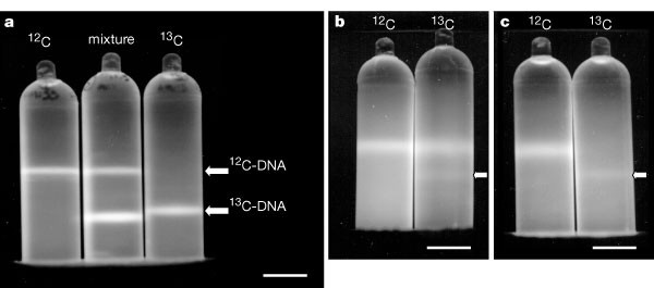 图1展示了利用CsCl/溴化乙锭密度梯度离心成功分离13C-DNA与12C-DNA的结果。纯培养实验中,Methylobacterium extorquens在13CH₃OH底物培养下生长形成的DNA浮力密度显著高于在12CH₃OH底物处理的样本,表现出明显的“重”DNA带
