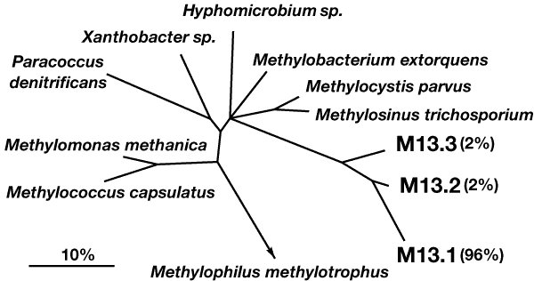 图3所示的mxaF基因(编码甲醇脱氢酶α亚基)氨基酸序列系统发育树进一步支持了16S rRNA基因分析结果。从土壤13C-DNA中扩增获得的三个新mxaF序列(M13.1–M13.3)均聚类于α-变形菌纲,与UP(图2)的系统发育归属一致,表明这些新型mxaF基因来源于甲醇代谢活跃菌群。这些结果说明,功能基因与系统发育标记基因的联合分析可提高微生物功能识别的准确性,进一步验证了SIP技术在功能微生物识别上的可行性和可靠性