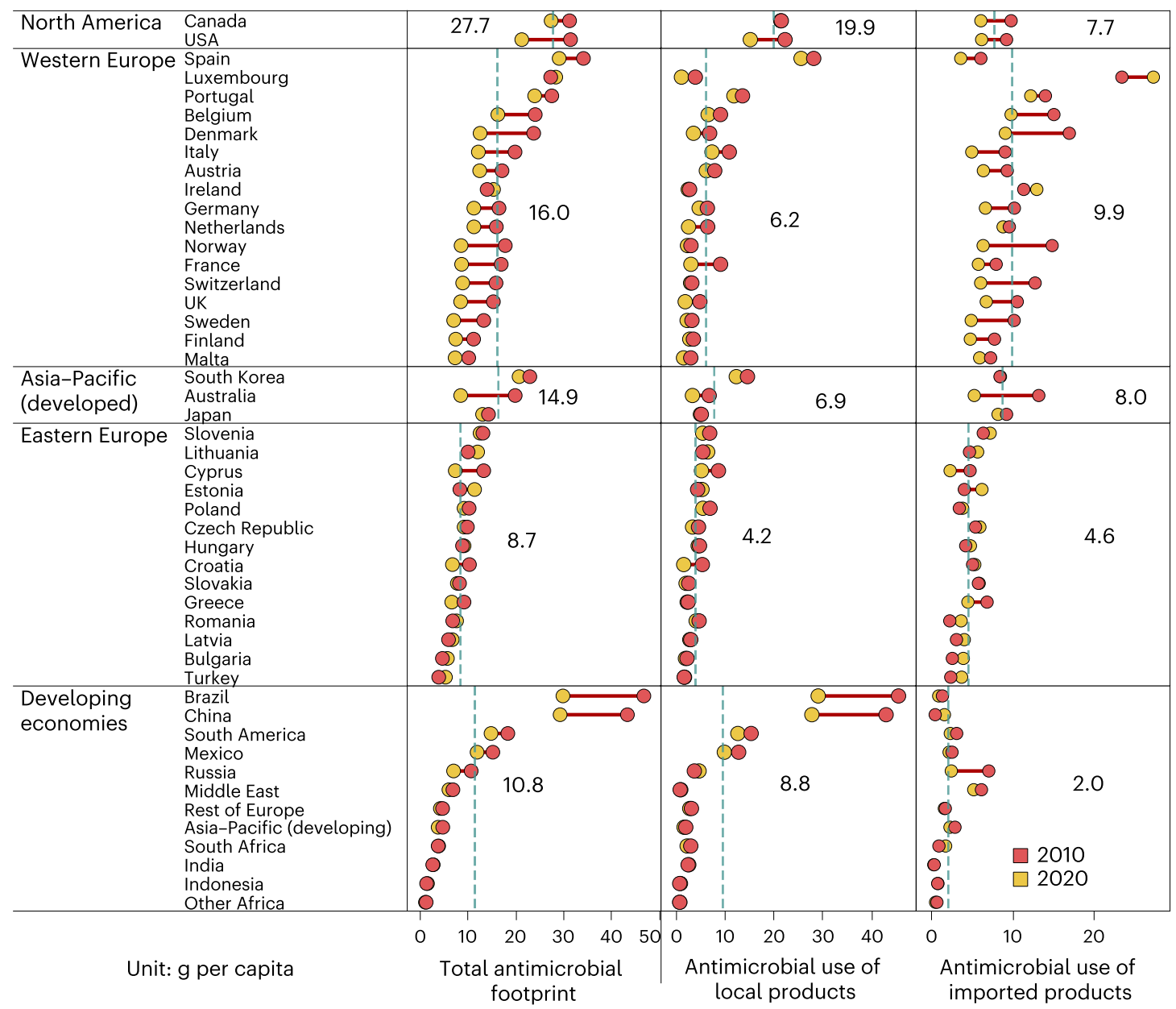 图 2010年和2020年全球不同经济体的人均畜牧业抗生素足迹