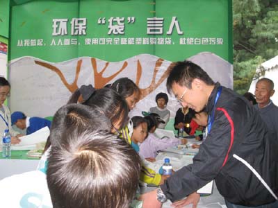 此次活动,该支部党员负责组织观众参与互动游戏并宣传相关科普知识。该展台主题为“倡导使用绿色包装,普及绿色包装知识”。在互动游戏中,无论是年过六旬的大爷大妈们,还是天真烂漫的孩子们,都认真地阅读手中的宣传手册,积极抢答问题。不少市民还对奖品-可降解玉米基淀粉塑料袋的制作和使用产生了浓厚的兴趣。在环保“袋”言人的绘画活动中,学生们用缤纷的画笔在白色环保袋上,描绘关于环境的万紫千红,展示了丰富的想象力和热爱自然的心情;许多画面还有机地结合了奥运的标志和主题,颇有创意。志愿者们也被现场这浓浓的求知热情和参与意识所感染。尽管秋风瑟瑟,秋雨潇潇,但热火朝天的活动现场使大家恍若处在暖春之中。