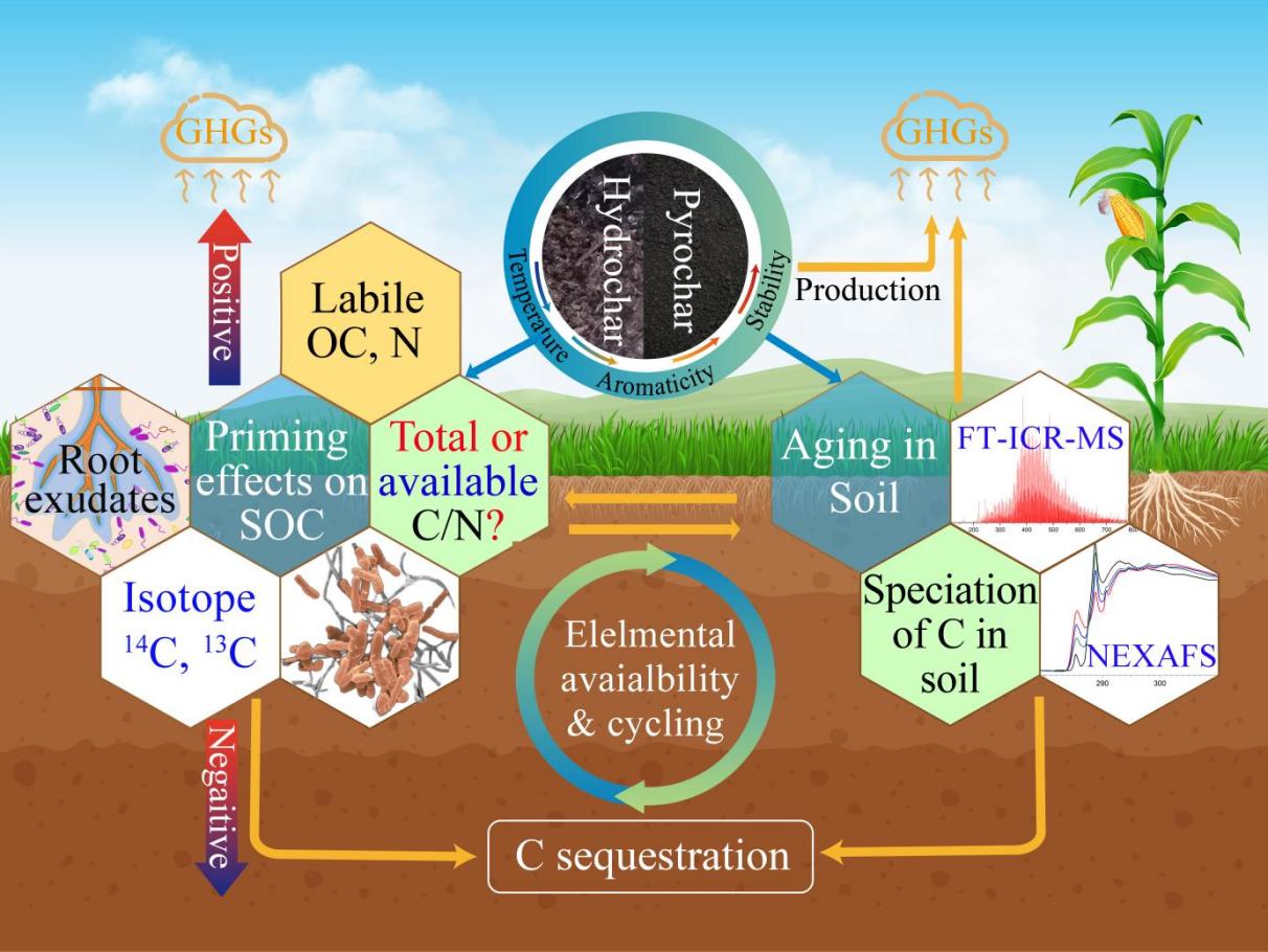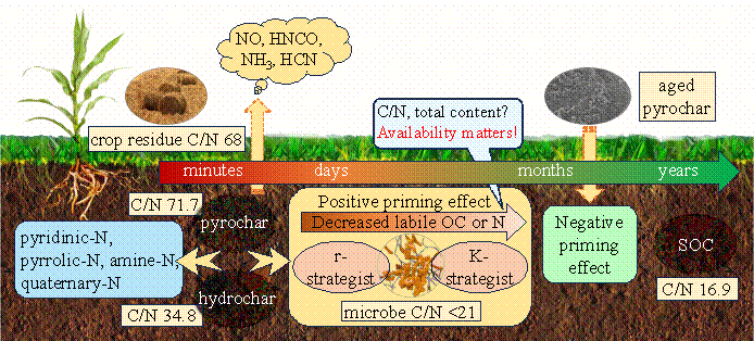 综述论文首先厘清了生物炭(biochar)(热解炭(pyrochar)和水热炭(hydrochar))的定义内涵;系统比较了热解炭、水热炭在土壤环境不同稳定性及主控因素;详细探讨了热解炭和水热炭诱导土壤有机碳分解的激发效应作用机制等关键问题。首次提出土壤环境中有效态C/N化学计量比是影响生物炭稳定性和有机碳在土壤环境转化的关键因素的观点(图2);全面阐述了生物炭中氮形态转化对土壤生态系统温室气体排放的重要贡献;通过对生物炭在土壤应用阈值、经济成本等方面限制生物炭在土壤固碳应用因素的分析,建议开展应用生命周期评价方法指导生物炭的固碳应用、降低其环境风险的相关研究。