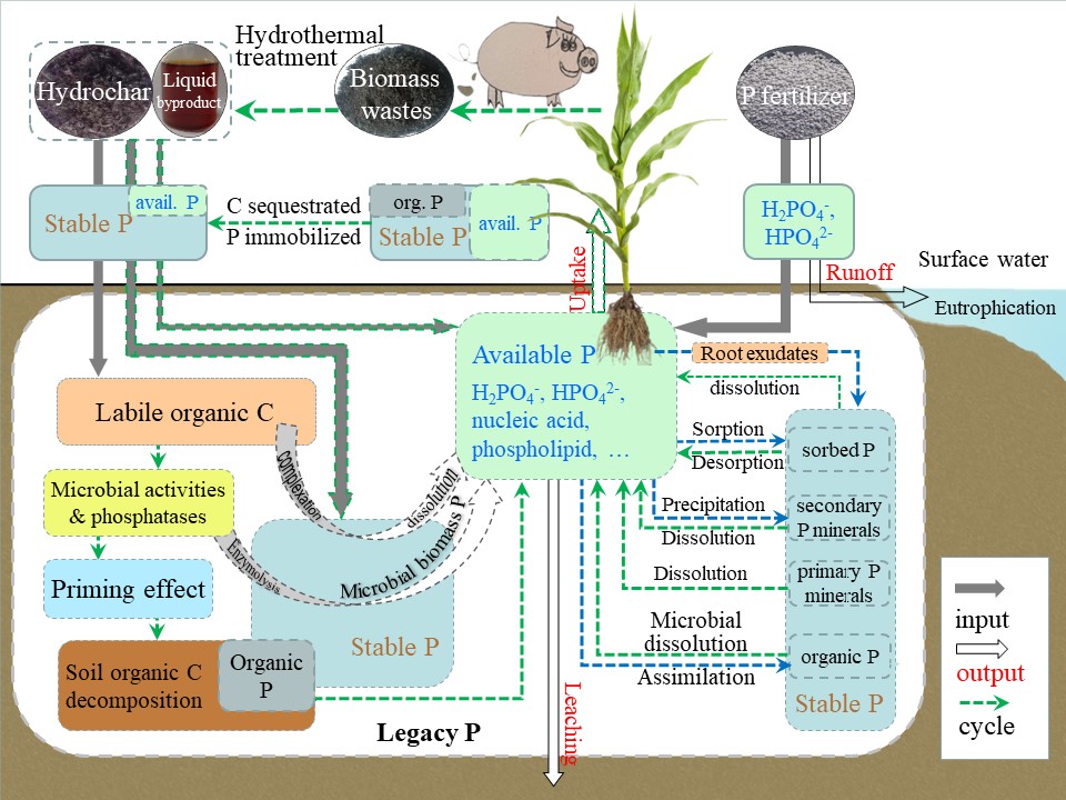 图3. 土壤遗留磷循环及水热炭的潜在影响作用机制