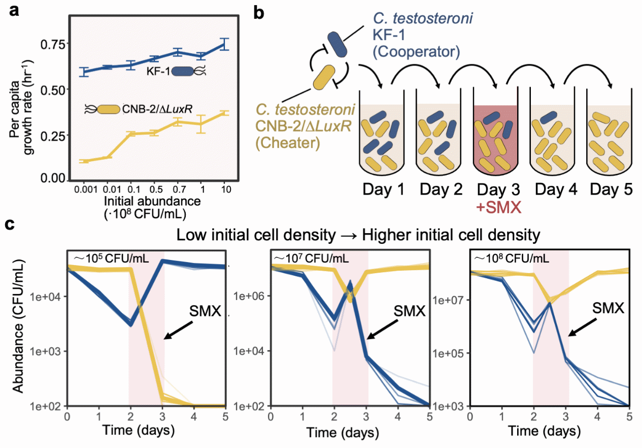细菌群落是一个错综复杂的生态系统,各成员传递信号、争夺资源并影响彼此的生长。环境中的抗生素使群落中的相互作用关系更加复杂,,出现了“合作者”(能够解毒并促进群体利益的细菌)与“作弊者”(利用他人利益的细菌)。作弊行为会抑制合作者的生长,损害群落多样性。在这样的背景下,如何实现二者的共存是一个待解决的科学问题。曲久辉院士团队微生物过程与调控组以前期研究中发现的具有解毒能力的菌株为例(Lin et al., AEM),探究了在抗生素干扰下具有不同抗生素敏感性的细菌共存行为,揭示了维持细菌群落生物多样性的机制。