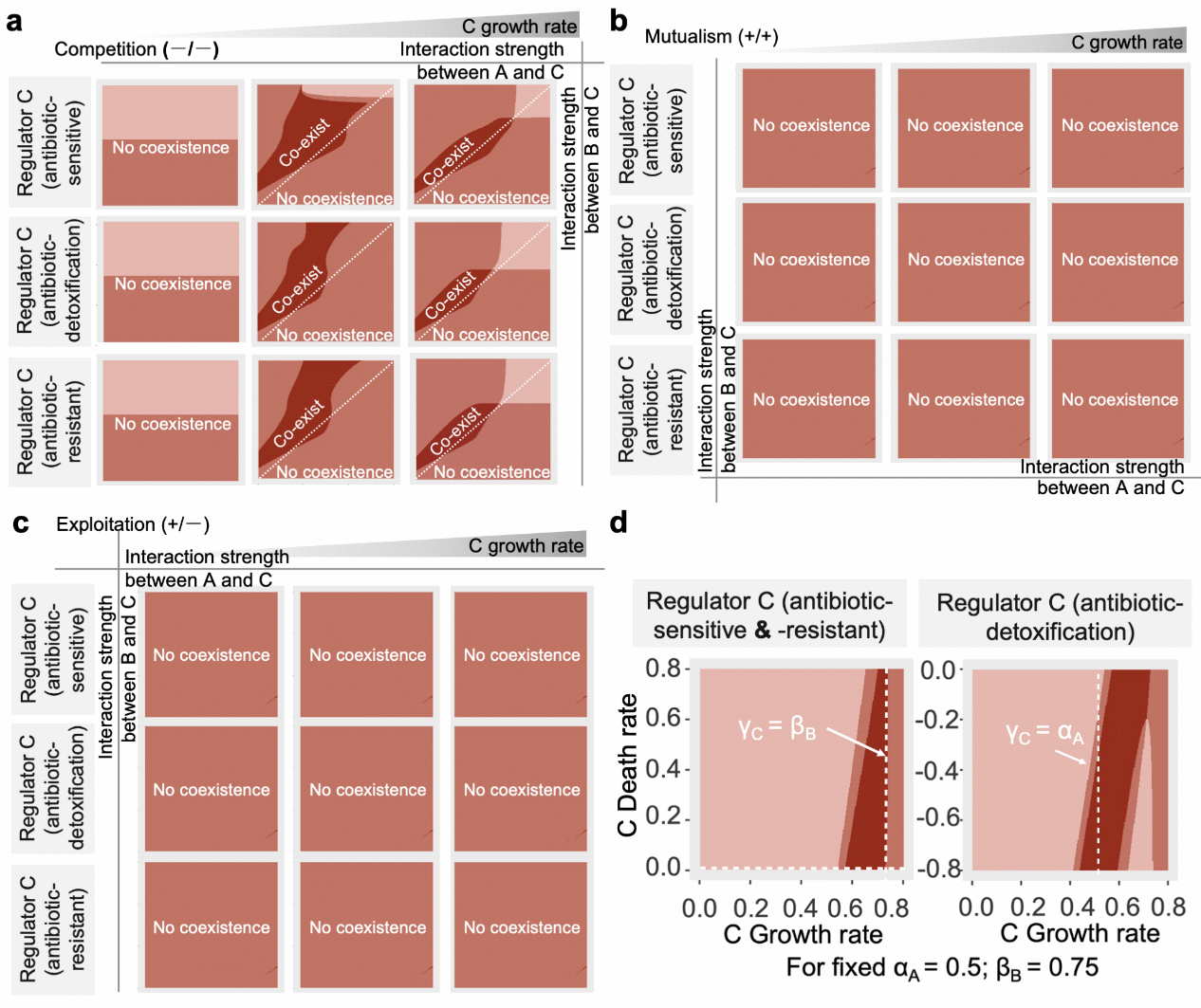 研究揭示了一个关键发现:物种间竞争性相互作用的出现可以有效抑制作弊行为。团队发现,在抗生素干扰下,当细菌表现出不同的生长速率和抗生素敏感性时,社会作弊行为阻碍了共存,符合群落的竞争排斥原理。进一步通过模型模拟和细菌群落实验,发现引入“调节者”(能同时监管合作者和作弊者的细菌)可以改变无法共存的局面,促进合作者和作弊者之间的平衡。研究强调了物种间成对的竞争性相互作用在促进抗生素干扰下共存中的关键作用。这对理解细菌生态系统的稳定性、解读抗生素-微生物组相互作用、预测细菌群落对环境变化的适应具有重要意义。