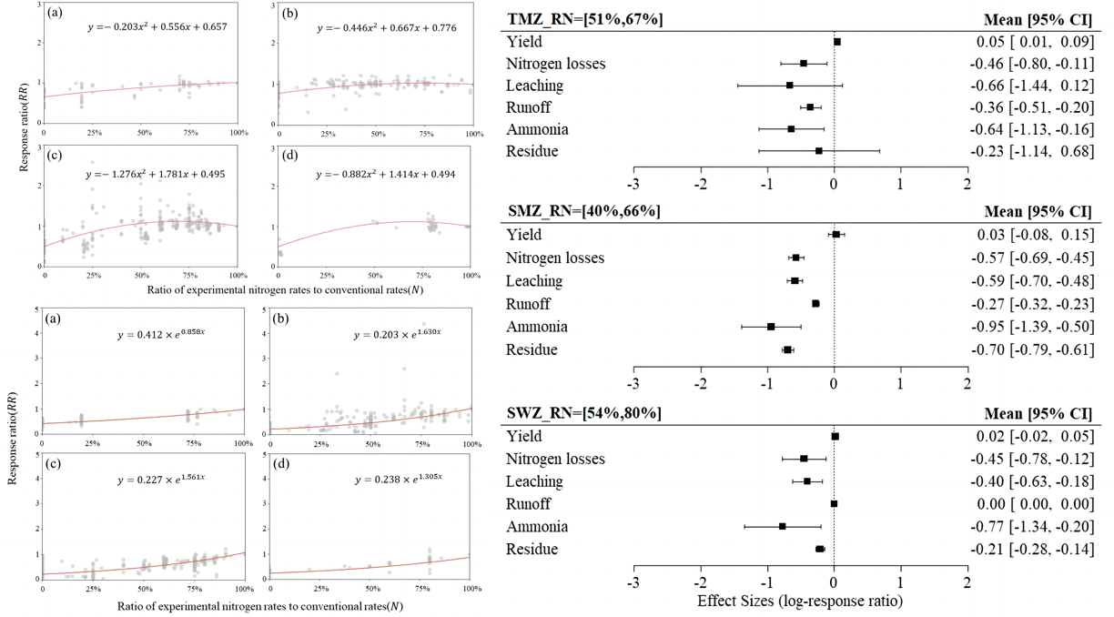 本研究收集了102篇文献共1123条数据,这些数据包括常规施肥量及减量施肥量下的蔬菜产量和氮流失(包括通过淋溶、径流、氨挥发产生的流失和氮沉积)。由于不同区域气候和地理差异对蔬菜生产影响较大,收集的数据被划分为4个区域,包括:北方干旱半干旱地区和黄土高原区(NSL),东南季风区(SMZ),温带季风区(TMZ)以及西南地区(SWZ)。将每个实验施氮量与其对应的常规施氮量的结果作为一对数据进行后续的分析,施氮比例与结果响应计算公式分别为:
