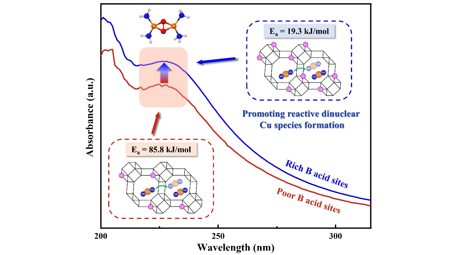 图1. Brønsted酸性位点空间分布对活性Cu离子移动性的作用机制示意图