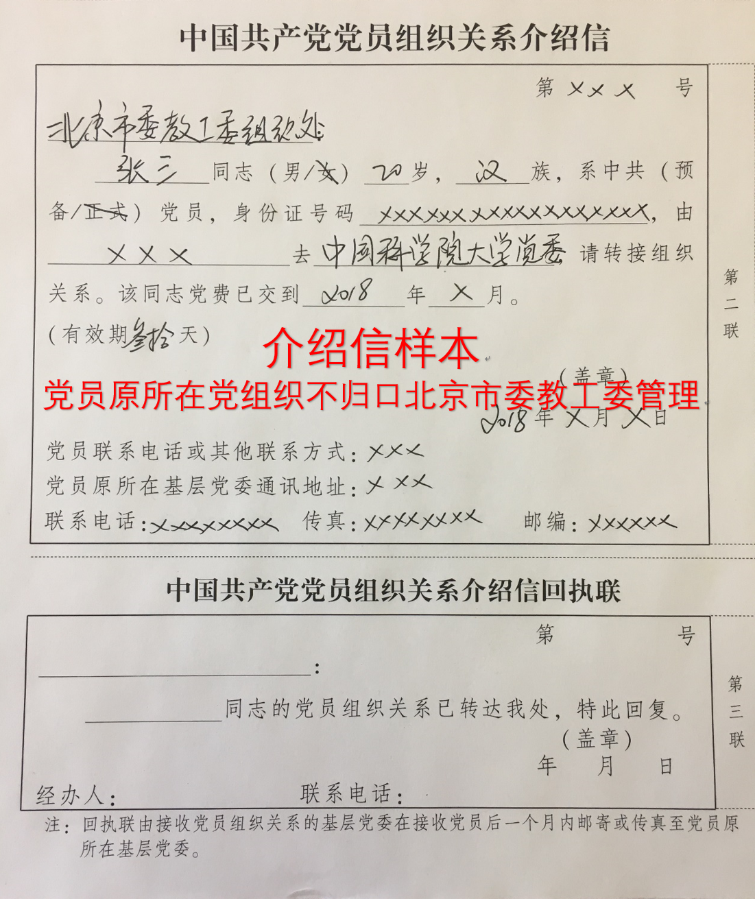 2. 党员组织关系介绍信需由县(团)级以上党委组织部开据,党员原所在党组织不归口北京市委教工委管理的抬头单位应填写:“北京市委教工委组织处”,去处应写“中国科学院大学党委”;党员原所在党组织归口北京市委教工委管理的抬头单位直接写:“中国科学院大学党委”。参加集中教学的研究生到中国科学院大学报到时,根据通知将组织关系介绍信交院系党委或学校党委组织部。