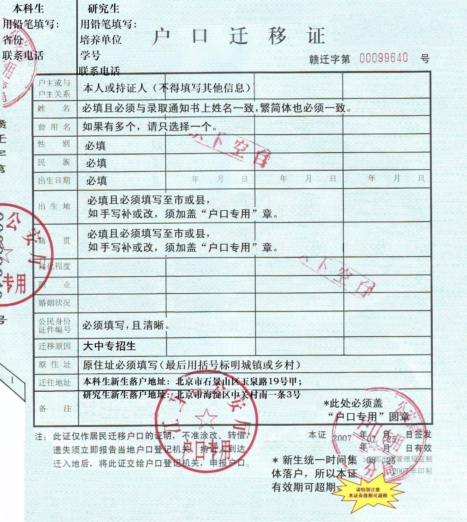 4.新生请提前在《户口迁移证》或《常住人口登记卡》的左上角用铅笔写上本人的联系电话、学号以及录取研究所或院系的名称。