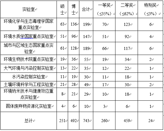 根据《生态环境研究中心研究生奖助学金管理方案》(科生环字〔2016〕14号),请各实验室对本实验室全体研究生(不包括2019级硕士生和直博生)2019年度的思想品德、学习成绩、科研工作等进行全面考核。在考核基础上评选出特别奖、一等奖和二等奖获得者。2019年度研究生奖学金共设特别奖≤24名,一等奖≤260名、二等奖≤459名。各奖项均由实验室考核得出,教育处不再评审。各实验室特别奖、一等奖、二等奖获奖名额见《研究生奖学金名额分配表》。请各实验室秘书将每位研究生的年度考核评价表纸板(附件1)、本实验室研究生考核结果电子版(附件2)于12月15日前统一报送教育处。