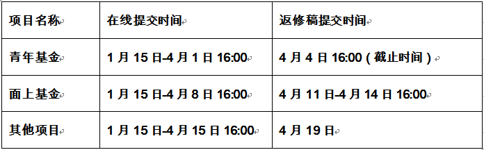 根据国家自然科学基金委发布的“关于推迟2020年度项目申请与结题时间等相关事宜的通知”和当前疫情防控工作需求,生态环境研究中心相应延迟各类型基金项目申请提交时间,各类型项目提交及返修时间如下: