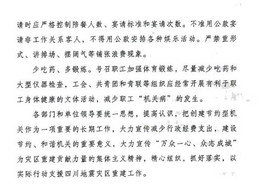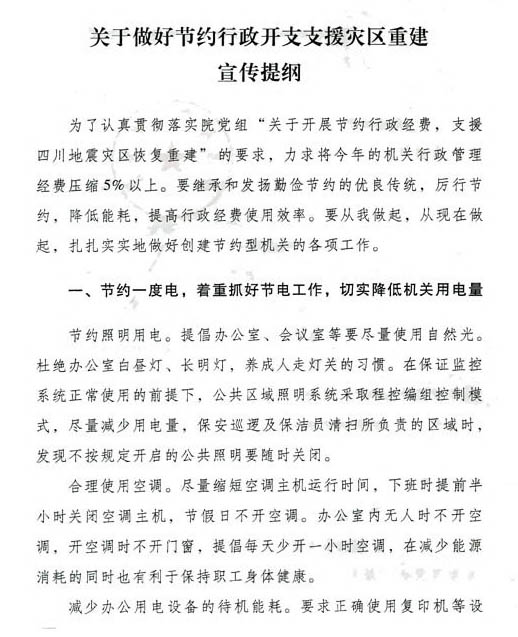 现将中国科学院办公厅下发的《关于做好节约行政开支支援灾区重建宣传提纲》(科办[2008]35号)转发如下,请中心全体职工、研究生积极响应号召,从节约一度电、一滴水、一升油、一张纸、一粒粮等做起,从我做起,厉行节约,以实际行动支援灾区重建工作。