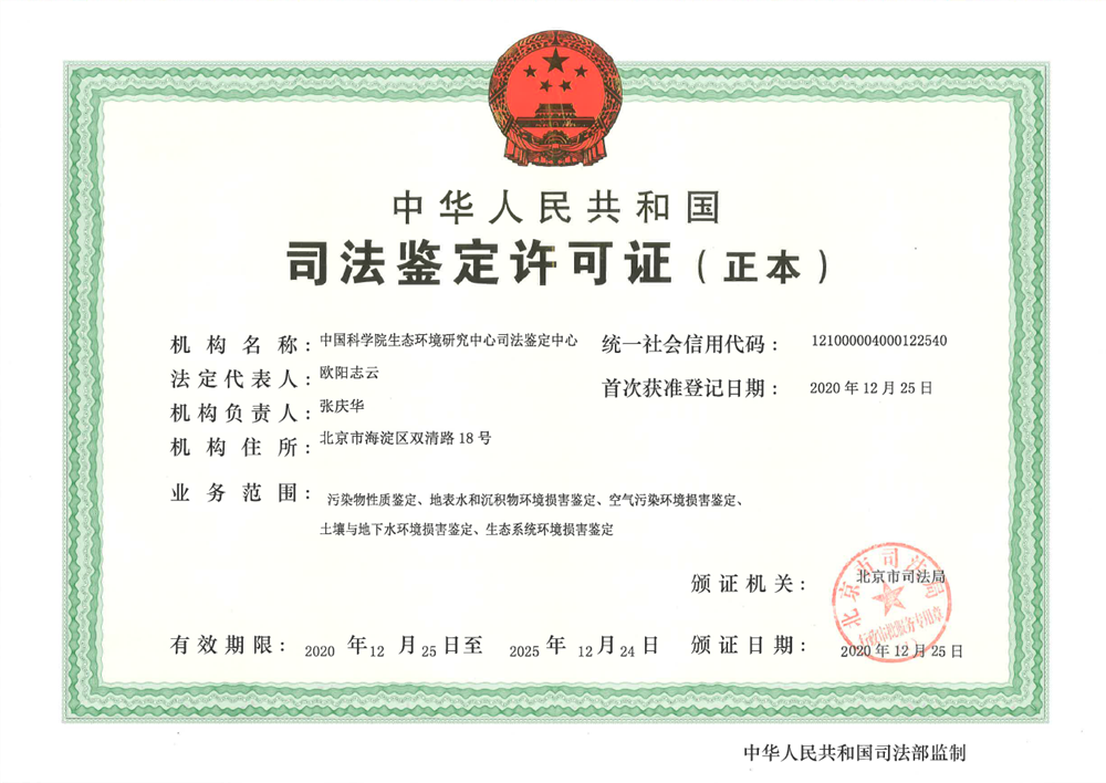 近日,环境化学与生态毒理学国家重点实验室牵头成立的中国科学院生态环境研究中心司法鉴定中心取得《司法鉴定许可证》,我中心24名科研技术人员获得《司法鉴定人执业证》,成为北京市首批取得环境损害司法鉴定业务资质的机构。《司法鉴定许可证》是司法鉴定机构的执业凭证,司法鉴定中心可以依法在污染物性质鉴定、地表水和沉积物环境损害鉴定、空气污染环境损害鉴定、土壤与地下水环境损害鉴定和生态系统环境损害鉴定五个领域开展司法鉴定活动。