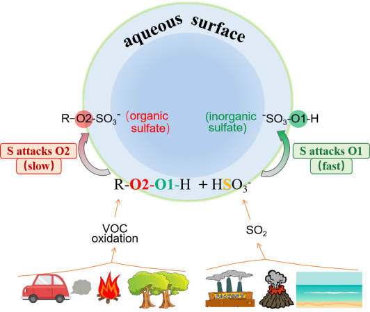 鉴于此,科学家对二氧化硫和有机过氧化物的液相反应开展了系列实验模拟研究,发现反应主要产物为硫酸盐和有机硫酸酯。然而,由于实验条件的限制,除硫酸盐和有机硫酸酯的相对含量高低存在争议外,反应的场所(在溶液内部还是在非均相界面上)和微观反应机理未知,限制了对大气二次颗粒物形成的准确预测。