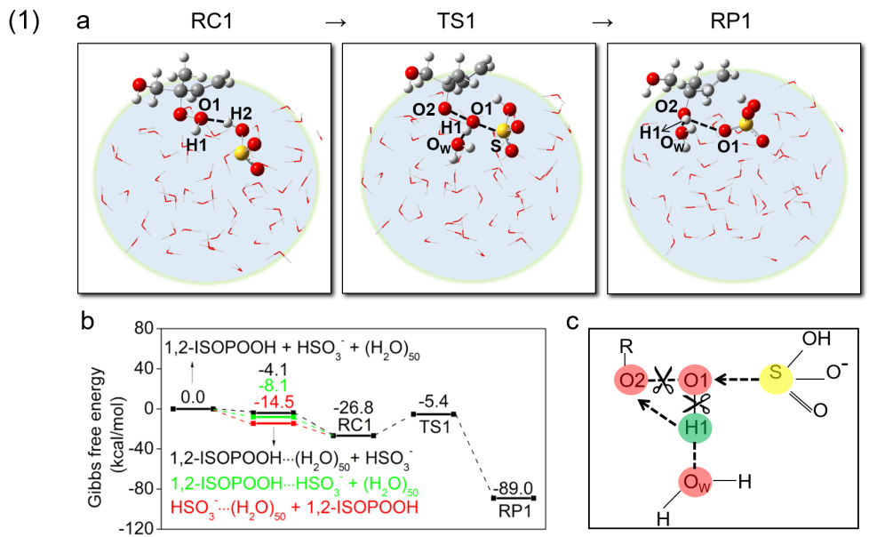 研究团队采用经典分子动力学模拟和量子化学计算相结合的手段,发现有机过氧化物和亚硫酸氢根离子(HSO3-:二氧化硫在液相中的主要存在形式)均具有很强的气液界面倾向性,这说明反应倾向于在非均相界面上进行。此外,还发现硫酸盐和有机硫酸酯的形成是由于HSO3-的S原子对过氧基团(-O(O2)O(O1)H)上不同O原子的进攻,即:当硫原子进攻O1原子时,过氧基团上的O-O键断裂,S和O1成键形成硫酸盐(图2 (1),以异戊二烯过氧化物为例);而当硫原子进攻O2原子时,S和O2成键形成有机硫酸酯(图2 (2))。动力学计算发现,对于不同的有机过氧化物,硫酸盐的形成速率都高于有机硫酸酯,表明硫酸盐的相对产率要高于有机硫酸酯。