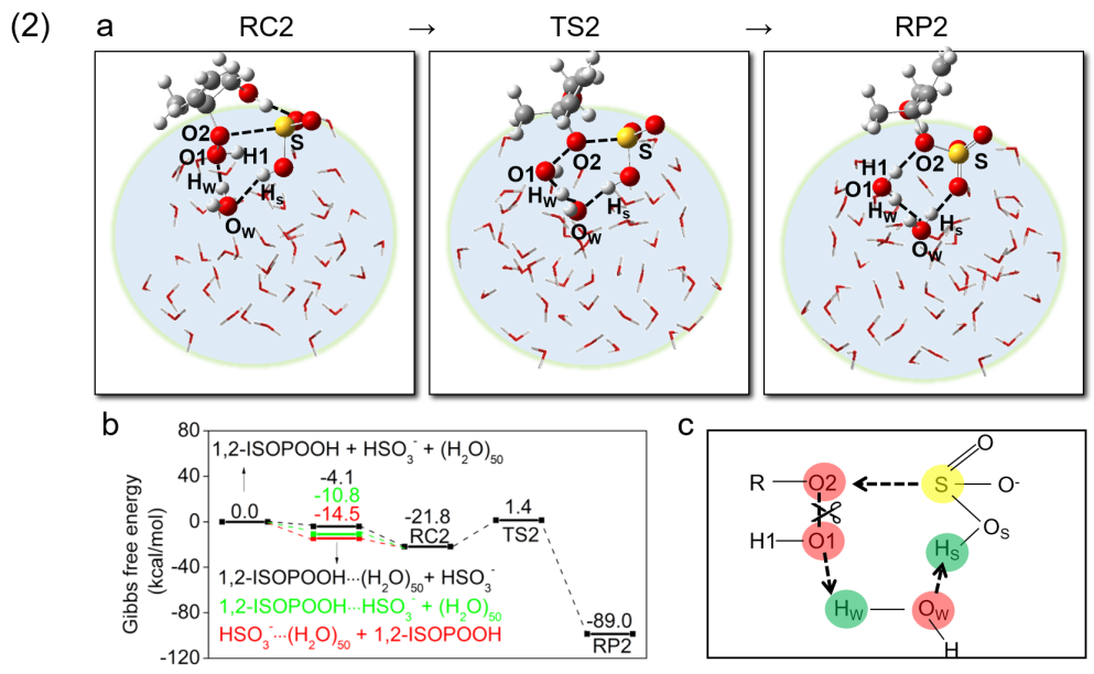 图2. 异戊二烯过氧化物与HSO3-的反应机理:(1) 产物为硫酸盐:a 反应物(RC1)、过渡态(TS1)、反应产物(RP1);b 反应势能面;c 关键反应位点示意图; (2) 产物为有机硫酸酯:a 反应物(RC2)、过渡态(TS2)、反应产物(RP2);b 反应势能面;c 关键反应位点示意图。