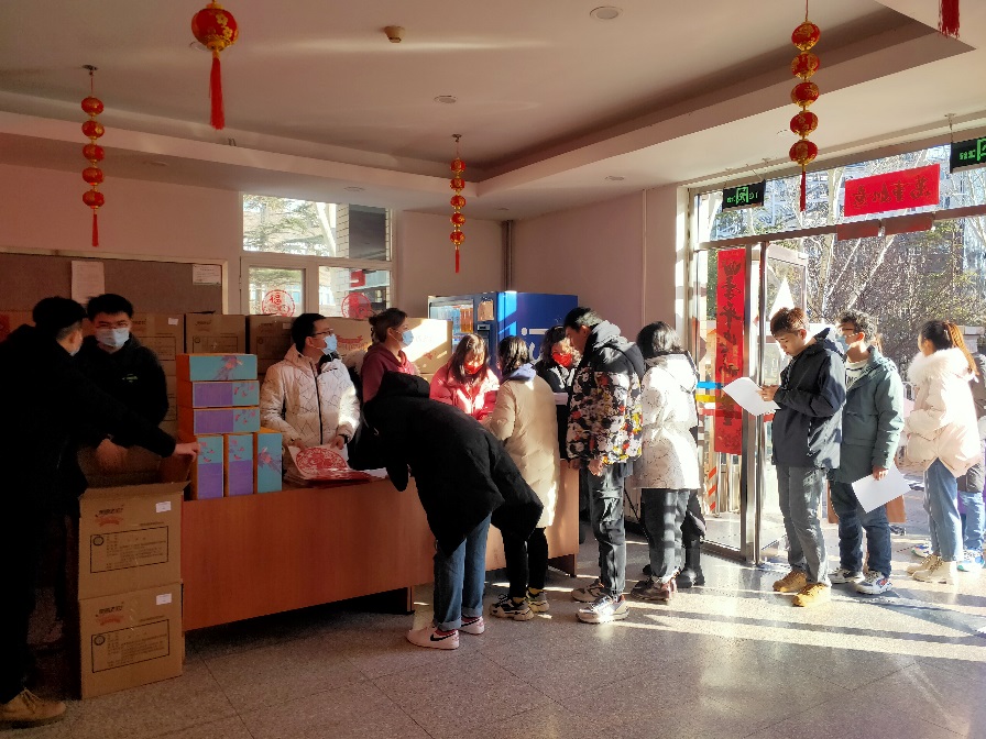 研究生公寓一楼大厅张灯结彩,在欢乐喜庆的节日气氛中,留京学生领取了慰问品、福字和年夜饭餐券。