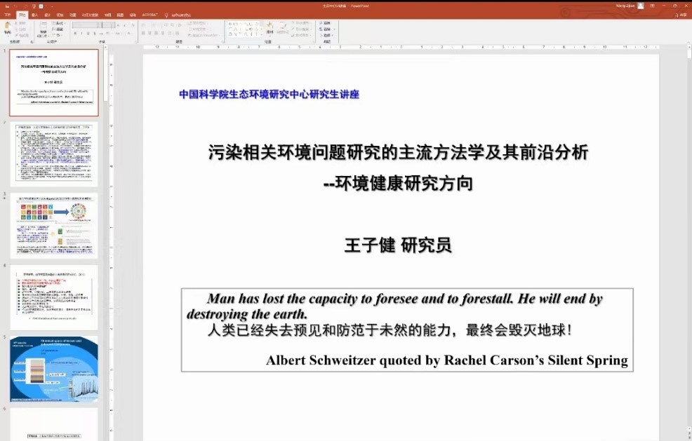 会上,王子健老师根据自身多年的基金评审经验,从青年们非常关注的环境健康问题出发,作了题为“污染相关环境问题研究的主流方法学及其前沿分析-环境健康研究方向”的报告,结合具体的案例为我们详细讲述了环境健康领域20世纪传统研究方法和21世纪新路线方法。在报告过程中,他为青年们指出了未来的重点研究方向和主流、前沿研究方法;提醒我们研究工作必须要聚焦某一个科学问题然后进行深入的研究,研究方向不宜过多,强调从事环境健康问题研究需要多学科知识,并对我们以后的学习提出了更高的要求。