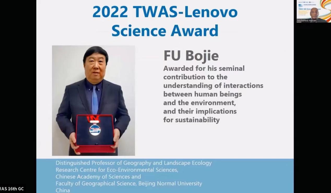 2022年11月21日,发展中国家科学院(TWAS)第16届大会在中国杭州(线上与线下)开幕,发展中国家科学院院长Mohamed Hanssan在开幕式上公布,2022年“发展中国家科学院—联想科学奖”(TWAS-Lenovo Science Prize)授予中国科学院院士、中国科学院生态环境研究中心傅伯杰研究员,以表彰他在研究人与环境之间的相互作用及其对可持续性的影响方面做出的开创性贡献。