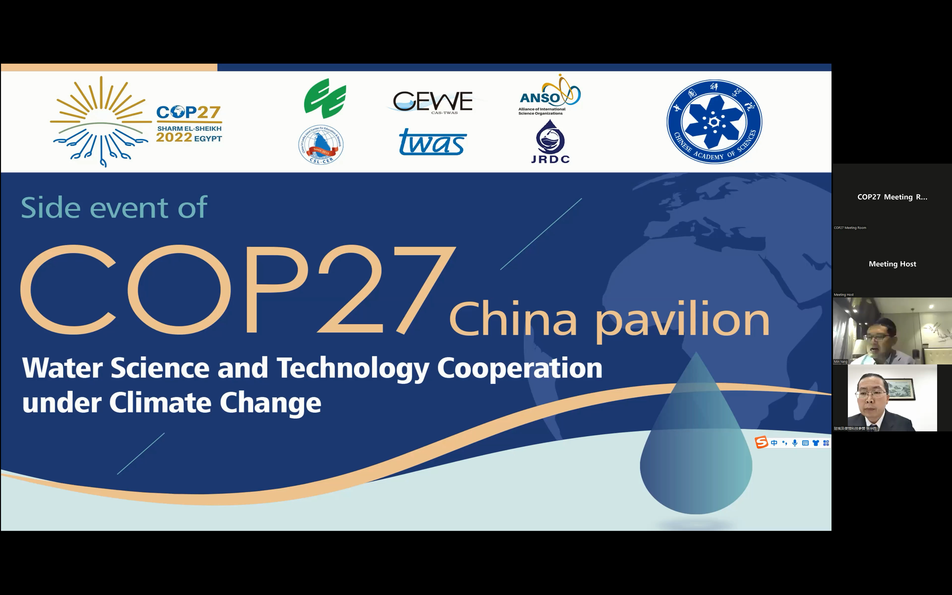 《联合国气候变化框架公约》第二十七次缔约方大会(COP27)于11月7日-11月20日在埃及沙姆沙伊赫 (Sharm el Sheikh) 正式召开。受生态环境部的邀请,中心于11月15日在COP27国家馆中国角(China Pavilion)以线上线下结合的方式举办了“气候变化下的水科技合作”边会,分享气候变化下水科技的发展经验,推动水科技领域国际合作。会议由生态环境中心魏源送研究员现场主持,中国驻埃及使馆张华胜科技参赞、ANSO执行主任曹京华教授、生态环境中心副主任杨敏研究员和埃及、泰国、斯里兰卡以及国内清华大学、华北电力大学等80余位专家学者线上参加了边会。