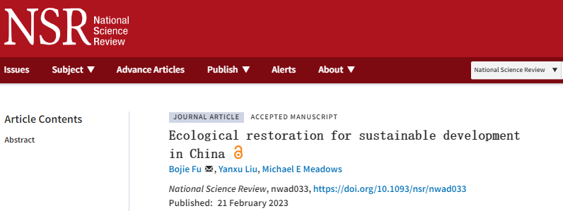 Bojie Fu, Yanxu Liu, Michael E. Meadows. Ecological restoration for sustainable development in China. National Science Review, 2023. https://dio.org/10.1093/nsr/nwad033
