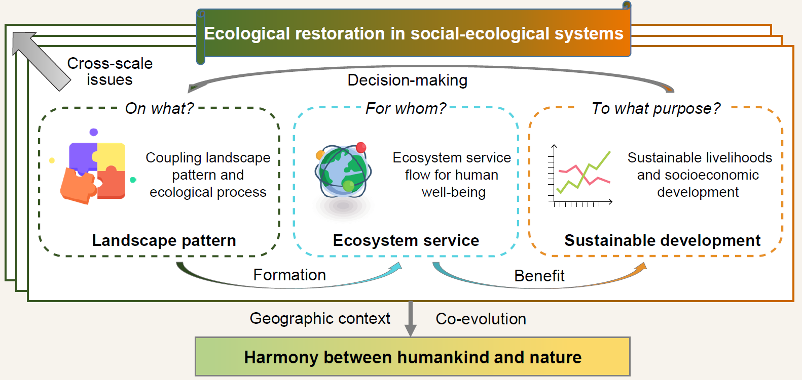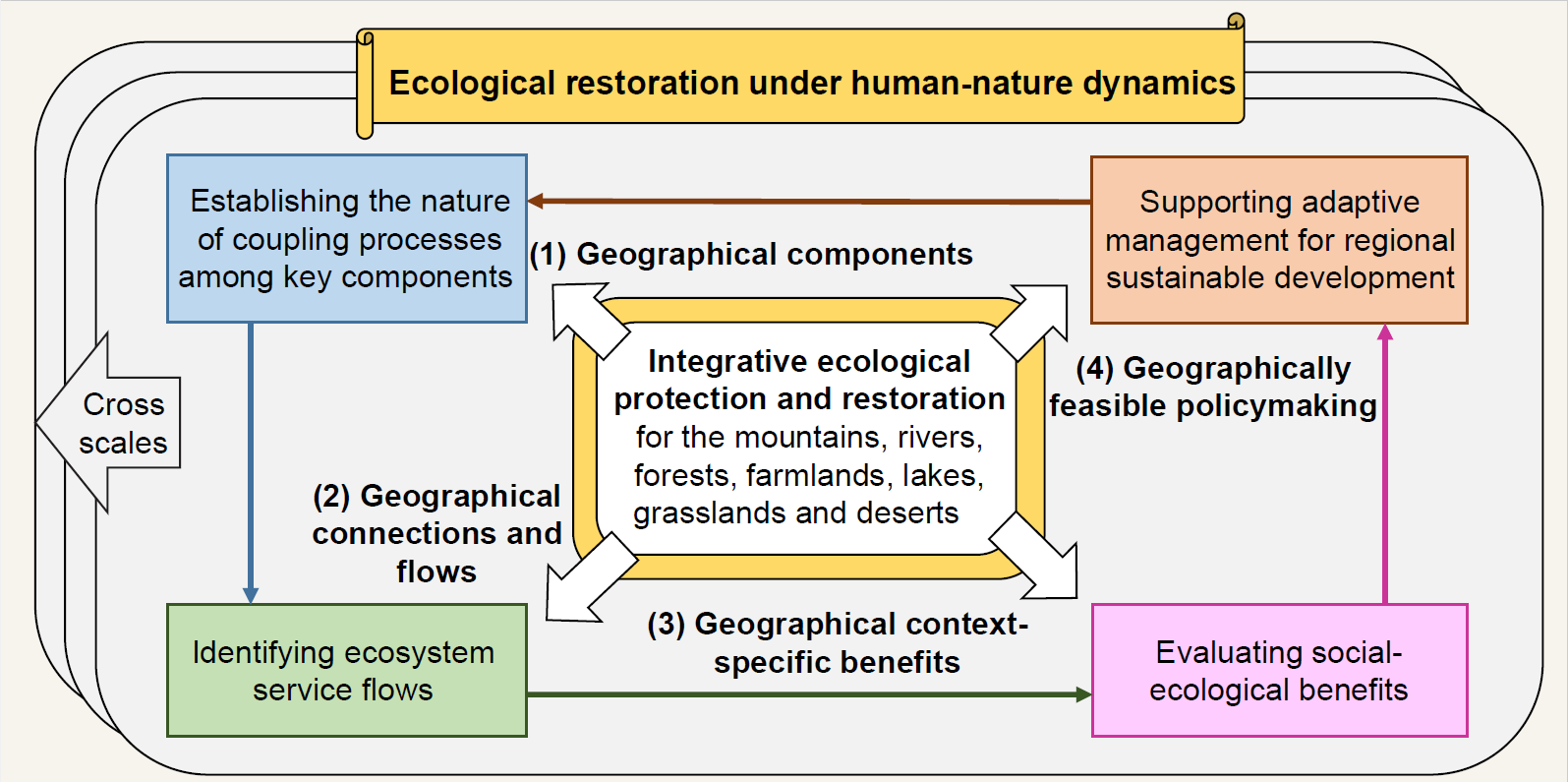中国幅员辽阔,生态系统类型多样,乡村发展水平差异大。科学认识不同地理环境下的人与自然关系,是制定生态保护修复政策,支撑可持续发展的前提。为此,傅伯杰院士等在人与自然关系的动态演化视角下,提出生态系统一体化保护与系统修复的四个地理学研究议题,包括解读系统关键要素之间的耦合过程;识别生态系统服务流;评估社会-生态效益;支持适应性管理,服务区域可持续发展。