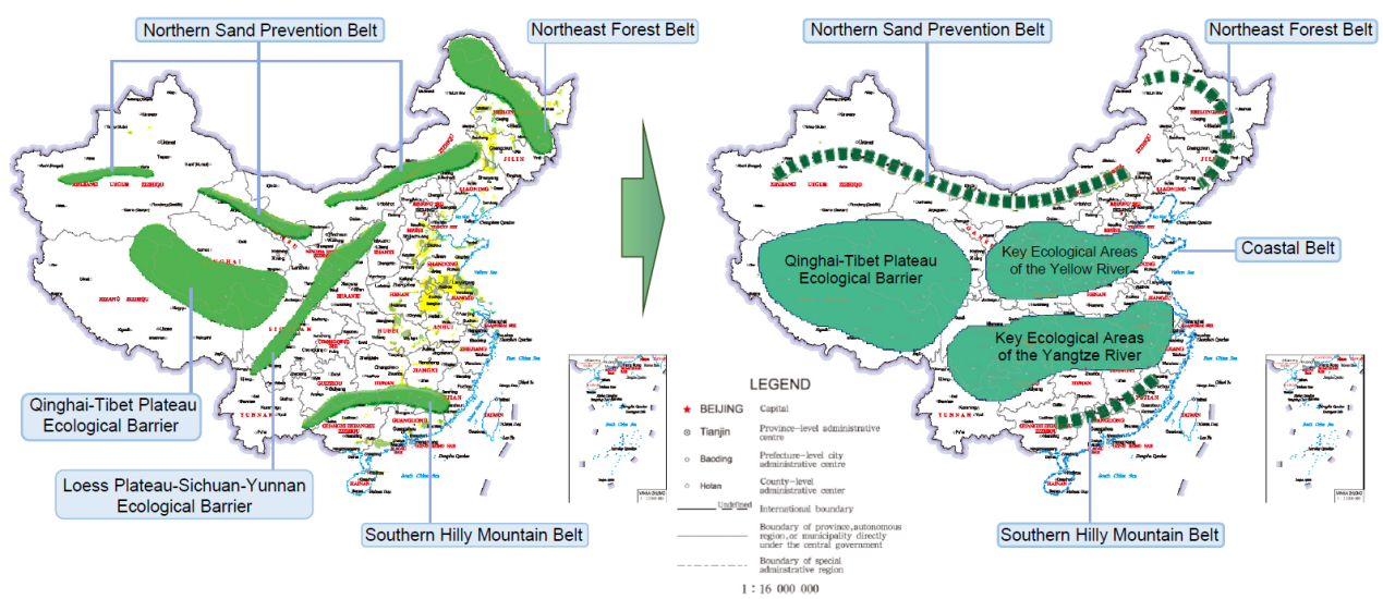 通过对17项大型生态保护修复工程及相关研究成果的系统梳理,分析了这些工程不仅生态环境效应,使碳汇增加、侵蚀减少,发挥了突出的生态效益。在地理空间上,从先前的国家生态安全战略格局到目前的全国重要生态系统保护和修复重大工程布局,中国生态修复的空间格局也更具地理单元的完整性。