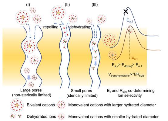 图2. 离子通过均匀尺寸孔道复合膜的选择性传输机制