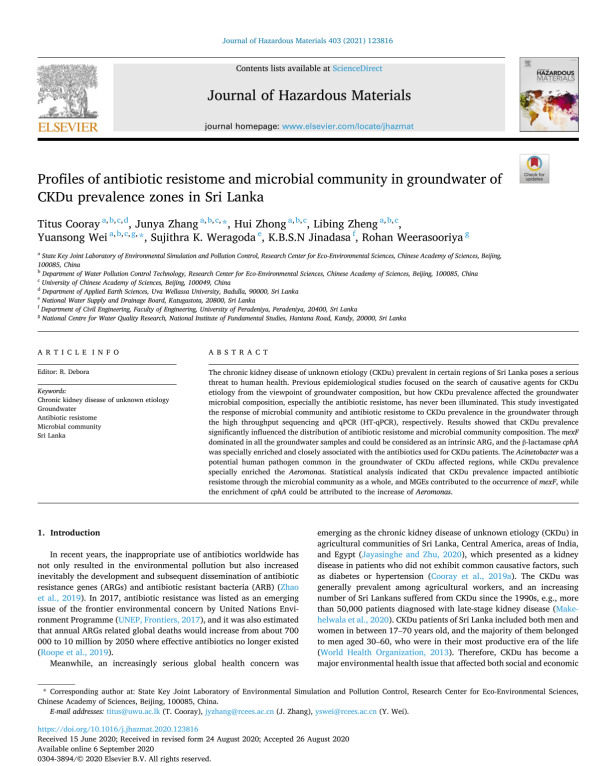 项目团队以斯里兰卡重大公共健康问题——不明原因慢性肾病(CKDu)为研究对象,选取斯里兰卡不同CKDu流行水平的地下水区域(高流行区、中度流行区、轻度流行区及非流行区),系统采集地下水样品,通过高通量测序和高通量定量PCR(HT-qPCR)技术,全面解析地下水微生物群落结构及抗生素耐药基因的分布特征。研究结果表明,CKDu流行程度显著影响地下水微生物群落组成及耐药基因谱型,高CKDu区富集潜在致病菌(如 Aeromonas、Acinetobacter等)及β-内酰胺类耐药基因(尤其是 cphA),而多重耐药基因 mexF则表现为斯里兰卡地下水中的背景耐药基因。进一步结合移动遗传元件及结构方程模型分析等,揭示了CKDu流行通过改变微生物群落结构并促进水平基因转移,从而驱动地下水耐药基因富集的潜在机制。该研究从微生物生态与抗生素耐药性视角深化了对CKDu流行区地下水环境风险的认识,为斯里兰卡CKDu病区安全饮用水管理及健康风险防控提供了重要科学依据。