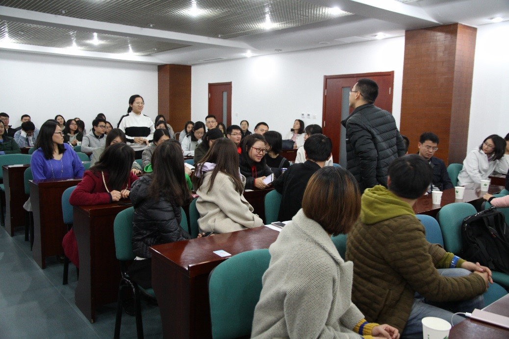 接下来是答疑交流环节。参加交流的前辈有:在大型国企工作的朱栟、丁文杰,在私企外企工作的布吉红、曾鲁哲;在事业单位工作的张健、苏红巧;从事科研工作的王瀛寰;跨界转行的周宁、申秋璇,以及自主创业的李龙飞。各位师兄师姐介绍了自己工作的酸甜苦辣,热忱回答了同学们的提问,并与同学们进行了分组讨论。