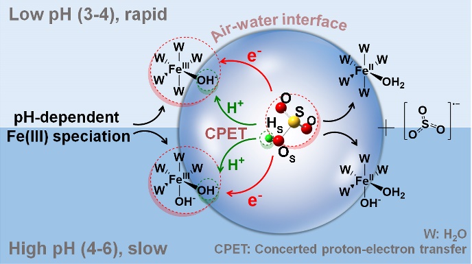 铁(Fe)作为大气中丰度最高的过渡金属元素,其催化S(IV)氧化的过程对大气硫化学和二次颗粒物生成具有重要意义。尽管已有研究证实该反应在气液界面的速率显著高于体相反应,但其界面加速机制尚不清楚,特别是pH依赖的Fe(III)配位结构演变对该反应过程的调控作用被长期忽视。传统观点通常将低pH条件下氧化速率加快归因于Fe(III)溶解度提高,而忽略了Fe(III)配体的形态差异(与OH-/H2O配位)对电子转移能力的影响,不同pH条件下各Fe(III)物种催化氧化S(IV) 的过程仍不清楚。